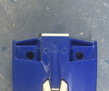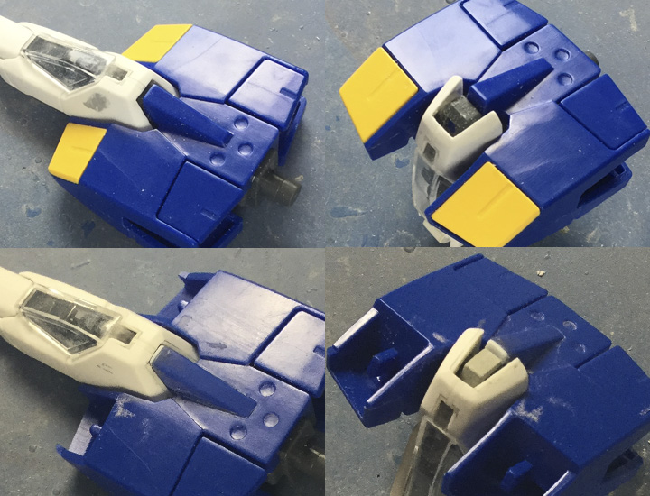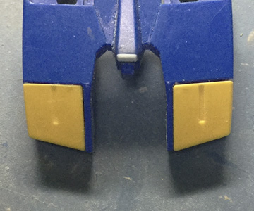 胴体とブースターポッド基部とのジョイント部に隙間があり流れが悪かったので1mmプラ板を貼って隙間が無くなるようにしました。さらに上面の三つ穴にマイナスモールドを掘り込みました。このモールドは頭部電装系のコネクターという想定です。
